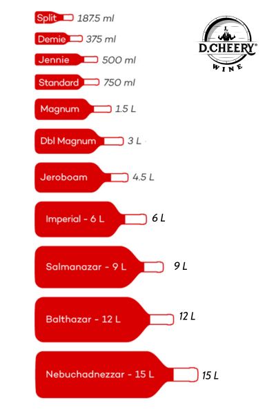 - 9.0 L Salmanazar: Tương đương với 12 chai 750 ml tiêu chuẩn hoặc một thùng rượu đầy đủ.