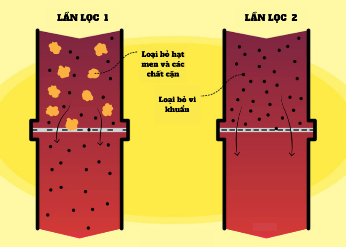 Trước hết, hãy bắt đầu với rượu vang lọc. Với rượu vang, khi hoàn thành quá trình lên men, nó sẽ có các chất cặn lắng xuống và men nổi. Khi đó, rượu vang sẽ được lọc 2 lần trước khi đóng thành chai. Lọc lần đầu để loại bỏ các hạt men và làm trong rượu, lọc lần hai để loại bỏ các vi sinh vật.