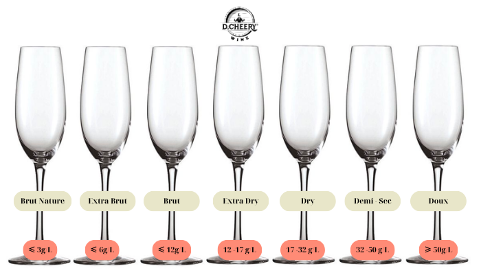 - Dry: Chứa đến 17-32 g đường dư/ lít rượu.